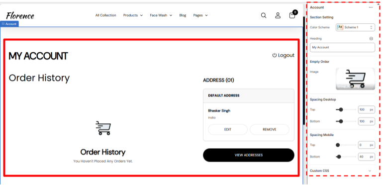 This is the Account page where the user can check their details like the orders they have placed or their own Address they can edit or delete the address.