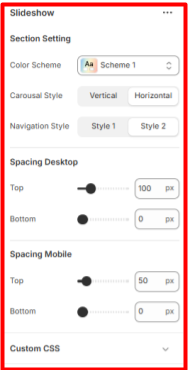 - Spacing (Desktop and Mobile): These settings adjust the top and bottom spacing of the slideshow section on both desktop and mobile views.